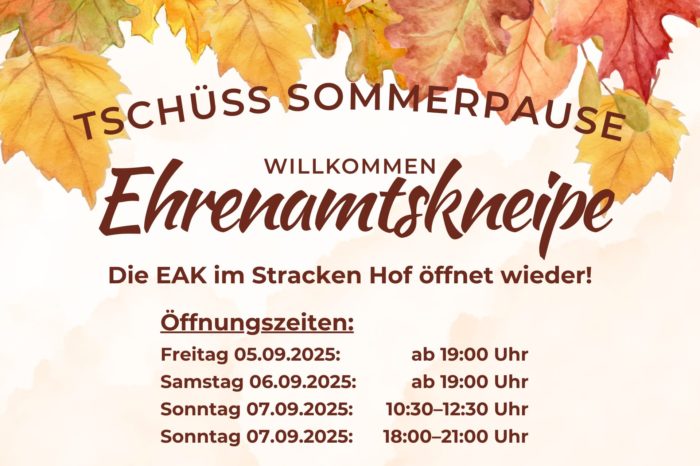 Nach der Sommerpause ist es endlich wieder so weit: Die Ehrenamtskneipe im Stracken Hof öffnet wieder!Los geht’s […]
