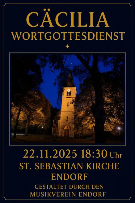 Der Musikverein wird am Samstag, den 22. November, den Wortgottesdienst in der St. Sebastian Kirche zu Ehren der heiligen Cäcilia musikalisch begleiten. Beginn des Gottesdienstes ist um 18:30 Uhr.