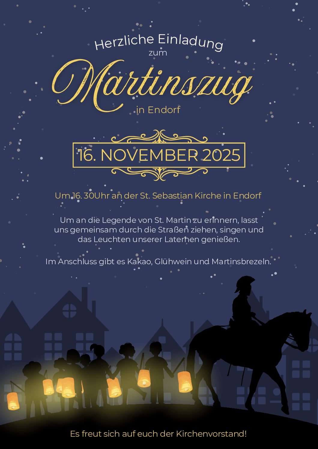 Laternenlicht, Musik und der heilige Martin auf seinem Pferd – der Endorfer Martinszug gehört fest in den Dorfkalender und sorgt jedes Jahr für leuchtende Augen bei Groß und Klein. In diesem Jahr findet er am Sonntag, den 16. November 2025, um 16.30 Uhr an der St.-Sebastian-Kirche statt.